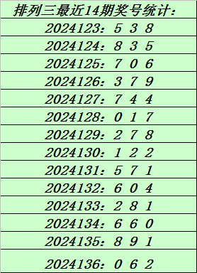 上期回顾:排列三第2024136期奖号:062。和值8,跨度6。