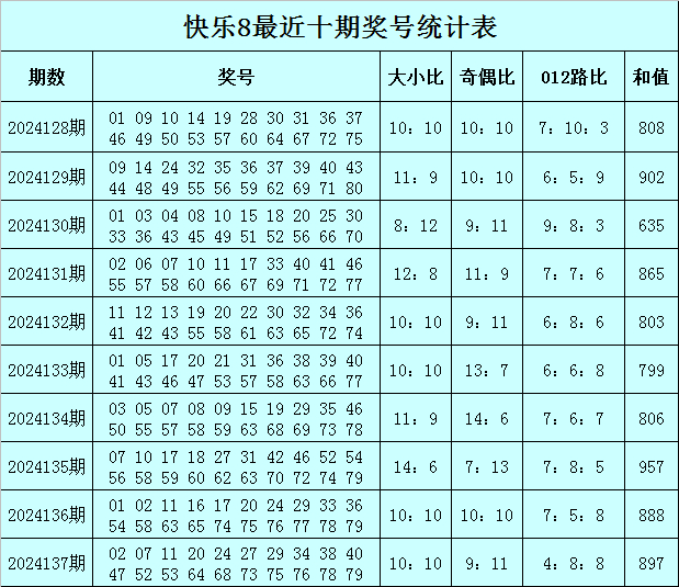 福彩快乐8第2024137期开奖回顾:02 07 11 20 24 27 29 34 38 40 47 52 53 64 68 73 75 76 78 79,其中奖号奇偶比开出9:11,大小比开出10:10,012路比开出4:8:8,和值为897,跨度为77。