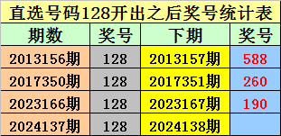排列三直选128出现之后下期奖号分别为:588-260-190。