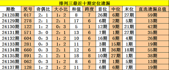 开奖回顾:排列三第2024137期奖号:128,定位直选遗漏值6期、6期、7期,遗漏总值为19期。