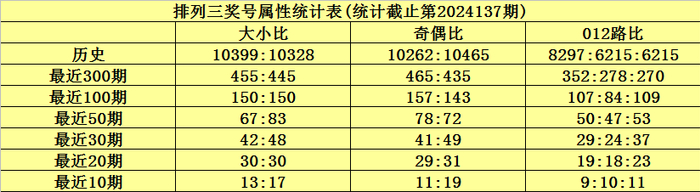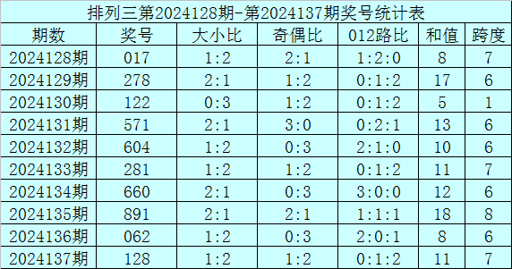 上期回顾:排列三第2024137期奖号为128,奖号012路比为0:1:2,奇偶比为1:2,大小比为1:2,和值为11,跨度为7。
