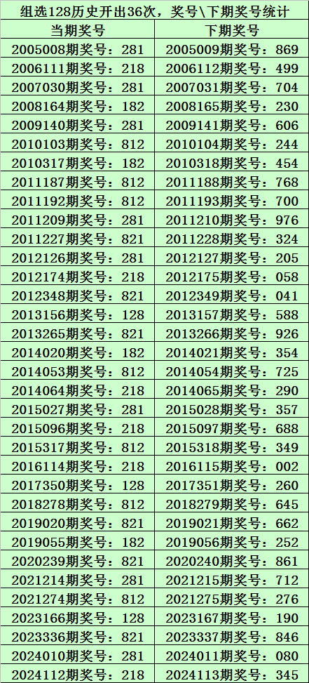 二、组选128分析:排列三历史上已开出36次组选号码128了,其奖号和下期开出奖号统计如下: