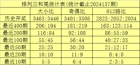 和尾质合推荐:统计前50期奖号,和尾质合比为30:20,质数和尾相对较多;统计前20期奖号,和尾质合比为11:9,和尾质合比例相当,本期注意开出质数和尾。