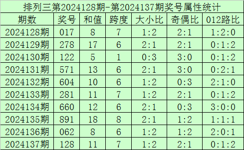 上期回顾:排列三第2024137期开奖号:128,奖号和值:11,奇偶比2:1,大小比1:2。