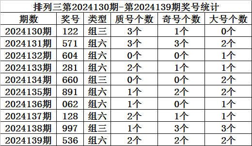 上期回顾:排列三第2024139期开奖:536,质合比为2:1,奇偶比为2:1,大小比为2:1。