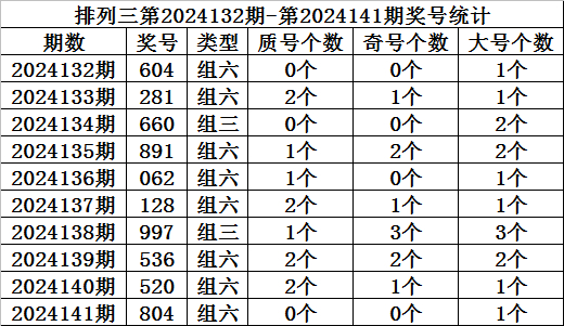 上期回顾:排列三第2024141期开奖:804,质合比为0:3,奇偶比为1:2,大小比为0:3。