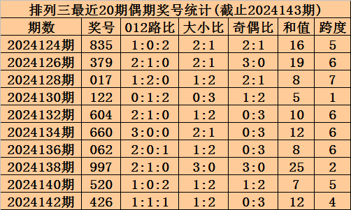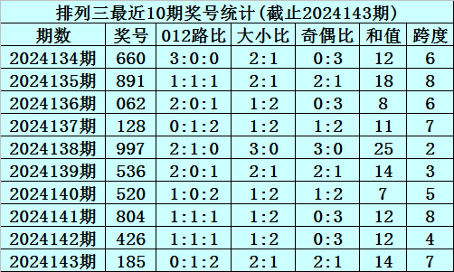 上期回顾:排列三2024143期奖号为185,奇偶比为2:1,大小比为2:1,跨度为14。