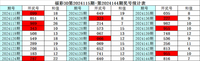上期回顾:福彩3D第2024144期奖号为:816,其中奖号组选类型为:组六,奇偶比为1:2,大小比为2:1,012路比为1:1:1,和值为15,跨度为7。
