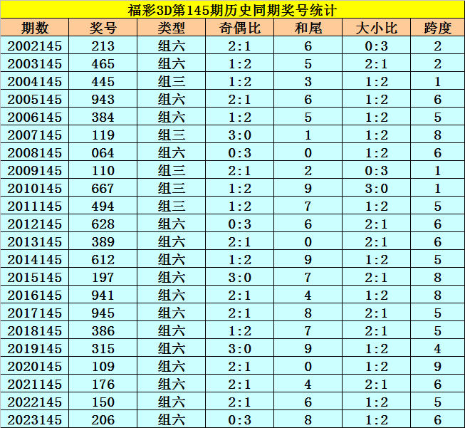 福彩3D历年第145期同期奖号为:213 465 445 943 384 119 064 110 667 494 628 389 612 197 941 945 386 315 109 176 150 206。
