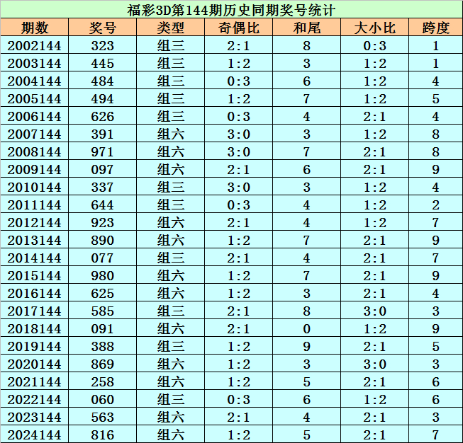 开奖回顾:福彩3D第2024144期开出奖号为816。
