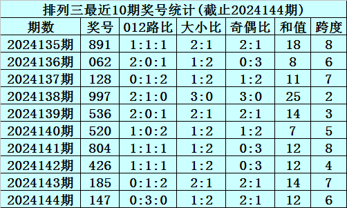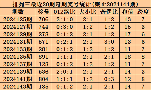 上期回顾:排列三2024144期奖号为147,奇偶比为2:1,大小比为1:2,跨度为12。