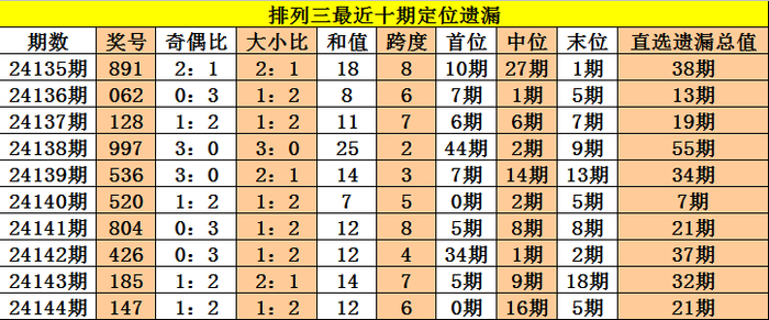 开奖回顾:排列三第2024144期奖号:147,定位直选遗漏值0期、16期、5期,遗漏总值为21期。