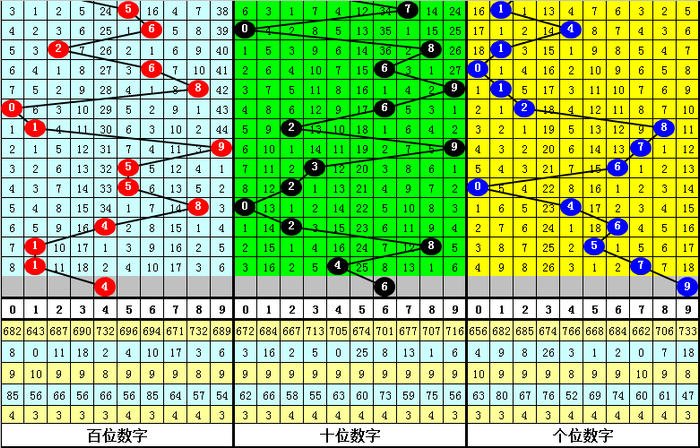 个位:近期质合号码出现比例基本持平,质数目前连续开出2期,本期放弃质数预计合数出现;另外,该位0路和1路号码在最近20期奖号中走势较热,2路号码表现相对较冷,本期该位放弃2路号码,参考号码9。