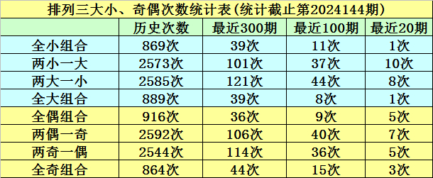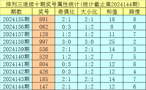 上期回顾:排列三第2024144期奖号:147。类型:组六,奇偶形态:奇偶奇,大小形态:小小大,和值:12,跨度:6。
