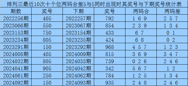 从以上统计可以看出,十个位两码合差5与5同时出现之后其下期两码合差表现最热的4个分别为:1246,本期十个位两码合差可以参考这四码中的数据。