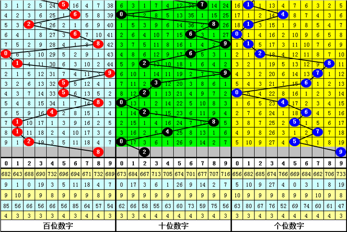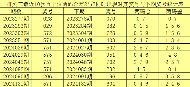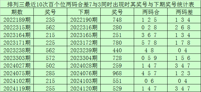 百个位合差分析:上期奖号百个位开出25组合,两码合为7,两码差为3,最近10次百个位两码合7与两码差3同时出现时,其奖号和下期奖号分别为: