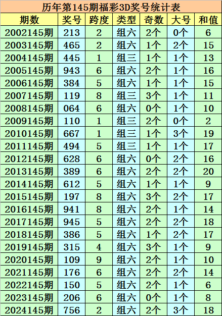 在以上奖号中奖,历年第146期福彩3D出现7次组三,出现15次组六。组六开出比例较高,本期继续关注组六。