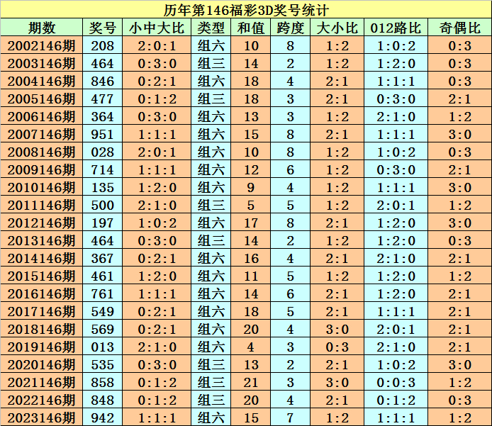 在历年同期开奖中,组三出现7次,组六开出15次,去年同期开出组六,今年同期看好组六再出。