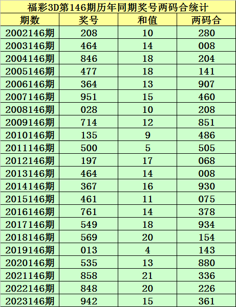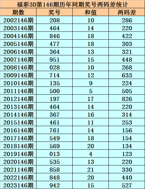 福彩3D第146期,历史上期开出22次奖号,其奖号分别为:208、464、846、477、364、951、028、714、135、500、197、464、367、461、761、549、569、013、五百三十五、858、848、942,奖号两码合差分别开出: