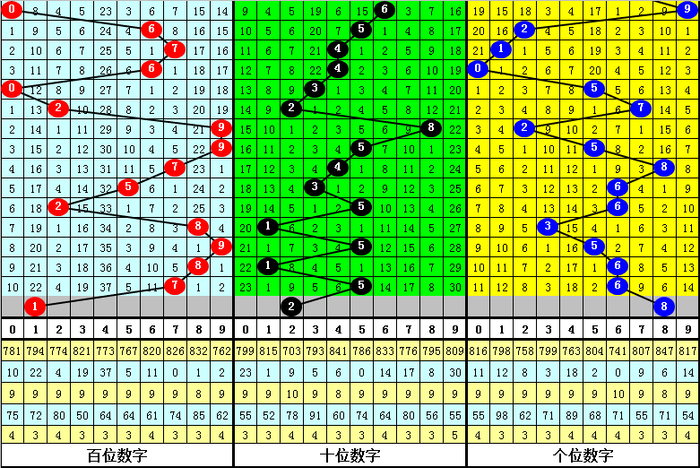 其中两码合0-9开出频次分别为:两码合0开出14次,8开出10次,3、4开出7次,1、6开出6次,2、5开出5次,7、9开出3次,其中两码合012路比为30:16:20,奇偶比为24:42,大小比为27:39;