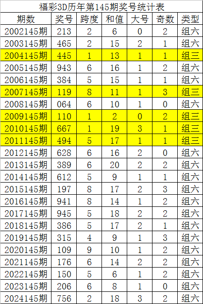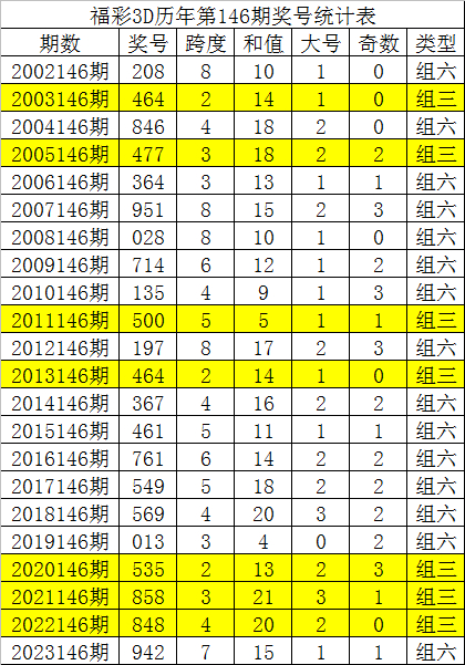 从以上统计可以看出,历年3D第146期开出了7次组三号码,开出了15次组六号码。组六号码出现概率大,本期预计开出组六号码。