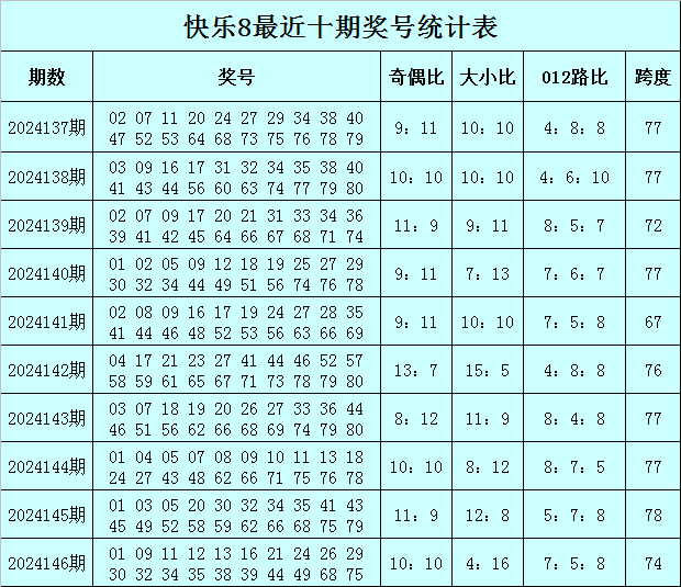 福彩快乐8第2024146期开奖回顾:01 09 11 12 13 16 21 24 26 29 30 32 34 35 38 39 44 49 68 75,其中奖号奇偶比开出10:10,大小比开出4:16,012路比开出7:5:8,和值为606,跨度为74。