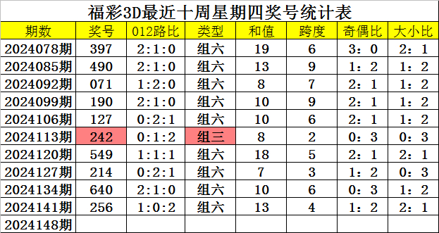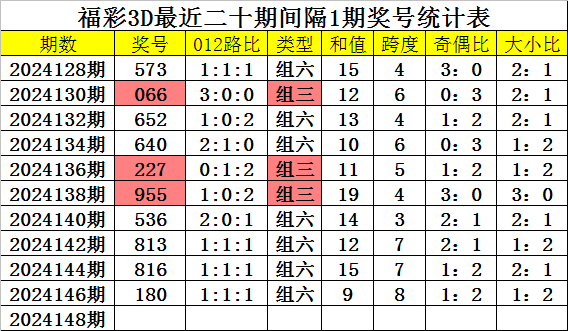 奖号类型分析:从近期周四开奖数据分析,组六近期热出,十周内出现9次,上周四为组六号码,组三出现1次,表现相对较冷,本周四预计继续开出组六号码。