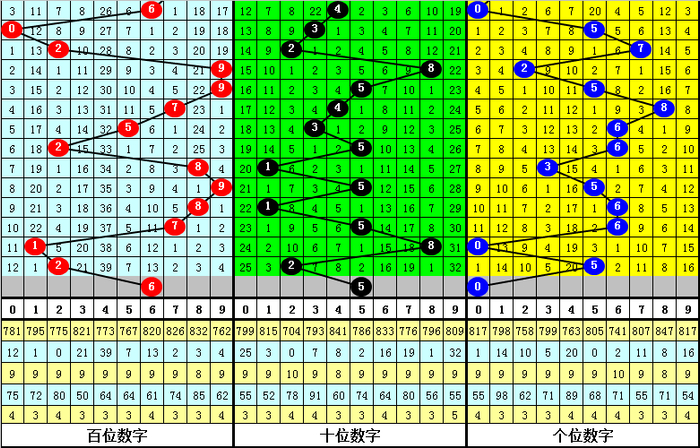 和尾分析:最近10周周四和尾为:9、3、8、0、0、8、8、7、0、3,波动了9个点位,和尾奇偶比为4:6,基本持平,和尾大小比为5:5,基本相当,本期参考和尾1。