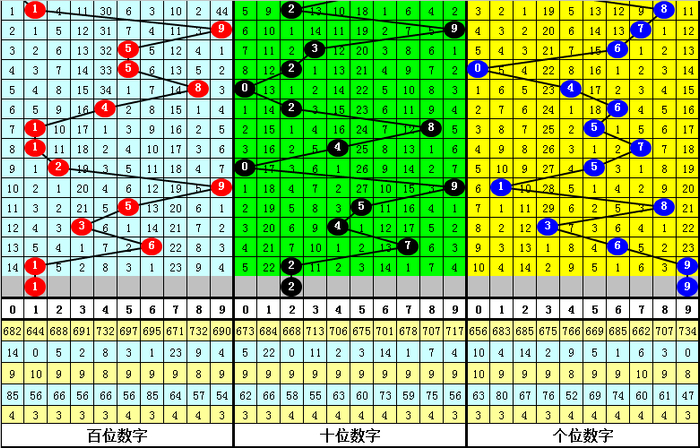 百位号码奇偶比为4:1,奇数号码表现相对较热,本期预计奇数号码再出;大小比为3:2,小号表现较冷,本期看好开出小号。