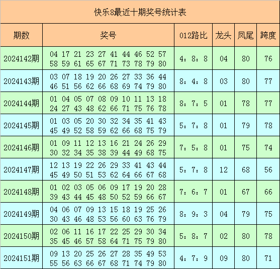 快乐8第2024151期奖号为:09 13 20 25 26 27 28 35 49 五十3 55 56 63 66 67 68 71 74 79 80,其中奖号012路比为4:7:9,跨度为71。