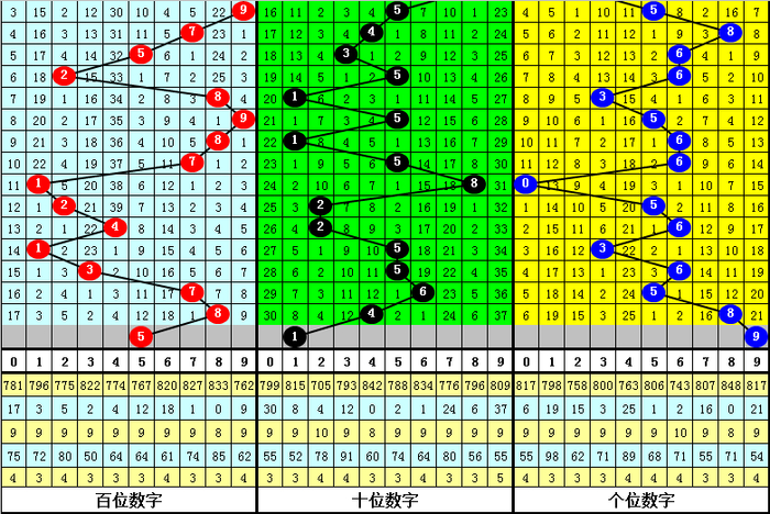 十位上期奖号为:温号4,最近十位主要为热号,冷号开出次数相对较低,本期该位有3个温号:1、3、8,注意温号逐渐回补,看好号码1开出。