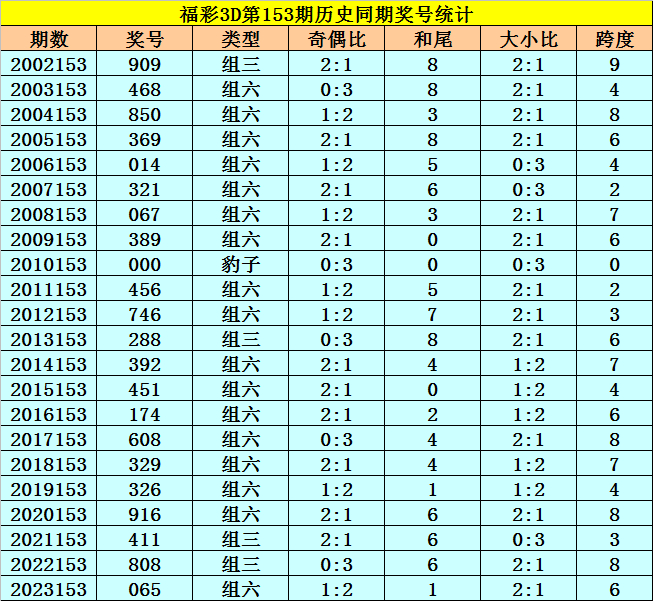 福彩3D历年第153期同期奖号为:909 468 850 369 014 321 067 389 000 456 746 288 392 451 174 608 329 326 916 411 808 065。