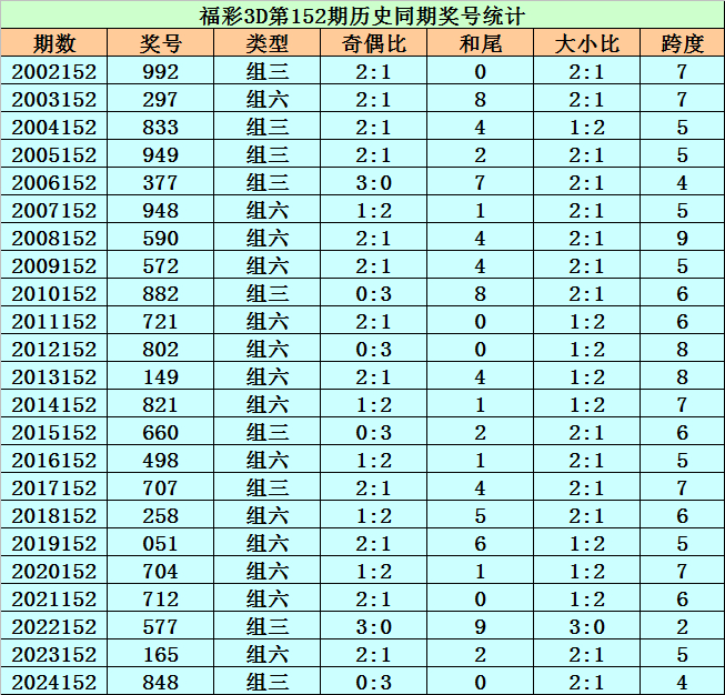 福彩3D历年第152期同期奖号为:992 297 833 949 377 948 590 572 882 721 802 149 821 660 498 707 258 051 704 712 577 165 848。