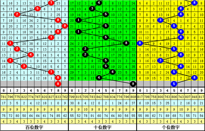 跨度分析:最近周二跨度出现范围在1-9区间,跨度走势较大,上周二跨度为8,跨度上升了4个点位,本期预计跨度下降,参考跨度4。