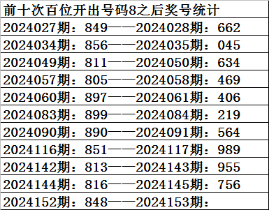 一、上期开奖:福利彩票3D第2024152期奖号为848。奇偶比为0:3,大小比为:2:1,奖号和值为20,奖号跨度为4。