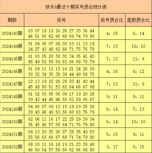 福彩快乐8第2024152期开出奖号:08 10 11 16 18 19 21 23 30 40 46 50 54 57 58 60 62 66 68 80,其中奖号质合比为3:17,奖号尾数质合比为5:15。
