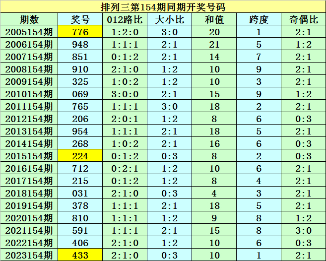 本期为排列三第2024154期开奖,开奖日期为:2024年6月12日,历史上排列三第154期已开出了19次奖号,历年同期开出号码分别为:776-948-851-910-325-069-765-206-954-268-224-712-215-031-378-810-591-406-433。