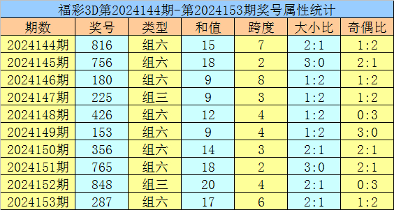 开奖回顾:福彩3D第2024153期开出奖号287。奖号形态为组六,奇偶比为1:2,012路比为0:1:2,大小比为2:1,和值为17,跨度为6。