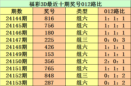 开奖回顾:第2024153期3D奖号为287。形态:组六,奇偶比1:2,大小比2:1,012路比为0:1:2。