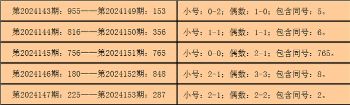 统计3D历史上已开出的奖号发现,在连续5期开奖号码中:3D在第2024143期-第2024147期分别开出奖号:955-816-756-180-225。