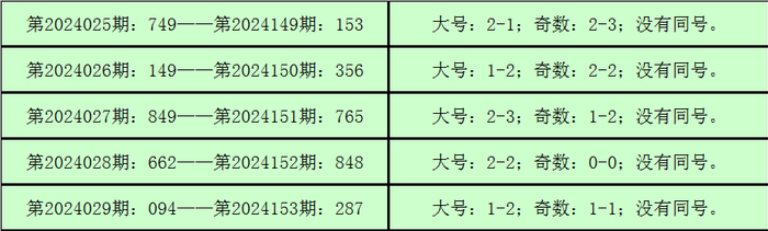 统计3D历史上已开出的奖号发现,在连续5期开奖号码中:3D在第2024025期-第2024029期分别开出奖号:749-149-849-662-094。