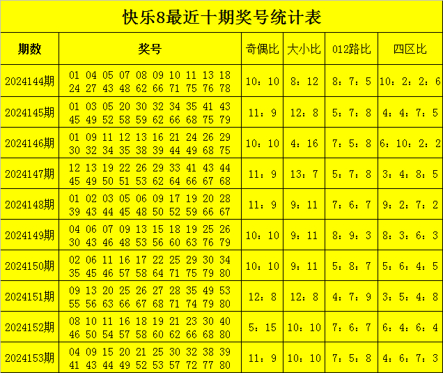 福彩快乐8第2024153期开奖回顾:04 09 15 20 21 25 30 32 38 39 41 43 44 49 52 53 57 72 77 80,其中奖号大小比为10:10,012路比为7:5:8,和值为801,跨度为76,奇偶比为11:9。