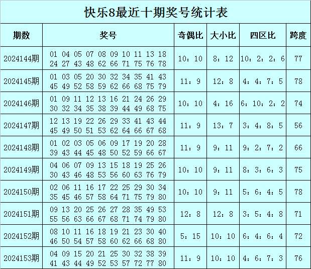 福彩快乐8第2024153期开奖回顾:04 09 15 20 21 25 30 32 38 39 41 43 44 49 52 53 57 72 77 80,其中奖号012路比为7:5:8,奖号尾数012路比为8:6:6。