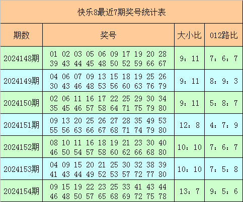 快乐8第2024154期奖号为:09 15 19 22 23 25 33 41 43 44 46 48 50 57 65 68 69 72 75 78,其中奖号012路比为9:5:6,大小比为13:7。