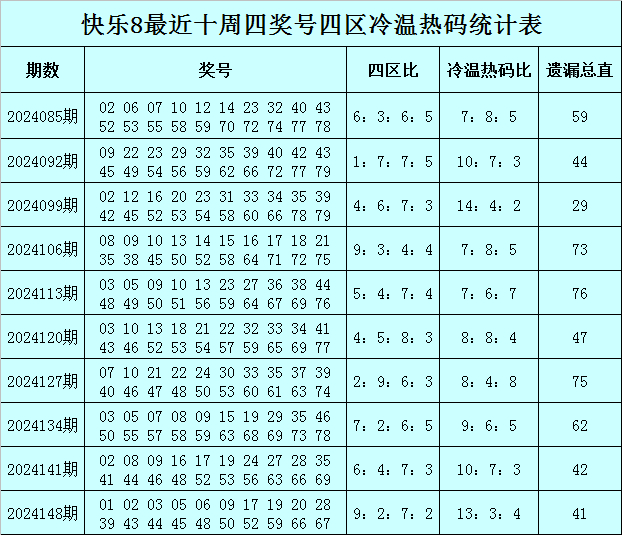 福彩快乐8第2024148期(上周四)开奖回顾:01 02 03 05 06 09 17 19 20 28 39 43 44 45 48 50 52 59 66 67,其中奖号四区比为9:2:7:2,冷温热码比为4:3:13。