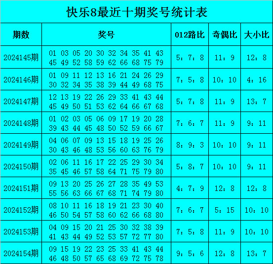 福彩快乐8第2024154期开奖回顾:09 15 19 22 23 25 33 41 43 44 46 48 50 57 65 68 69 72 75 78,其中奖号012路比为9:5:6,0路号码表现活跃。