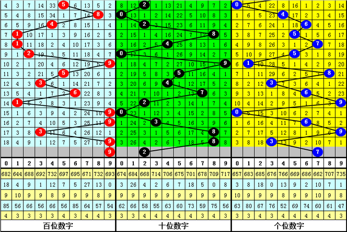 大中小分析:在组选0-9号码分布图中,前10期小号(0-2区段)出现7枚奖号,中号(3-6区段)出现12枚奖号,大号(7-9区段)出现11枚奖号,上期0小号区域断区,本期看好中号码走冷,注意3-6区段不落号。