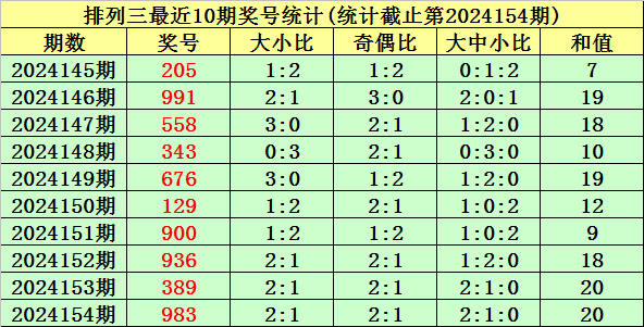 上期回顾:排列三第2024154期奖号为:983。奖号类型:组六,和值:20,奇偶比:2:1,跨度:6,大小比:2:1。