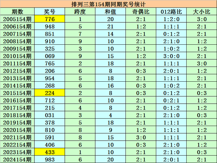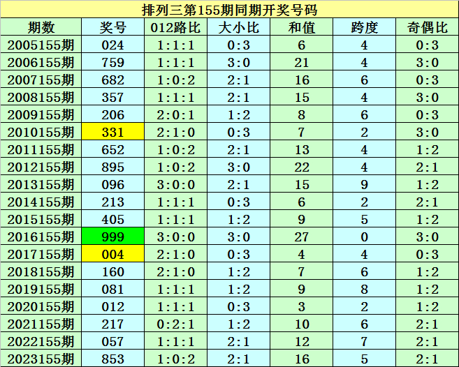 本期为排列三第2024155期开奖,开奖日期为:2024年6月13日,历史上排列三第155期已开出了19次奖号,历年同期开出号码分别为:024-759-682-357-206-331-652-895-096-213-405-999-004-160-081-012-217-057-853。