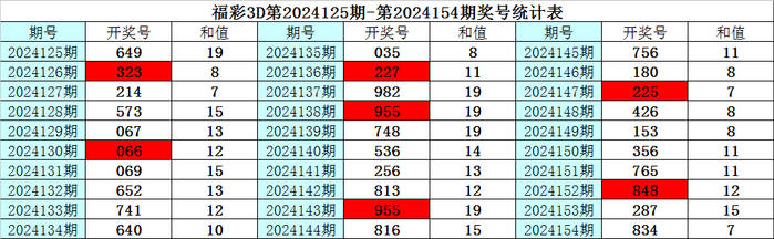 上期回顾:福彩3D第2024154期奖号为:834,其中奖号组选类型为:组六,奇偶比为1:2,大小比为1:2,012路比为1:1:1,和值为15,跨度为5。